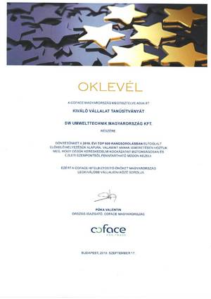 A Coface, a világ vezető hitelbiztosítója átadta cégünknek a Kiváló Vállalat tanúsítványt, a 2018. évi Top 500 rangsorolásban elfoglalt előkelő helyezésért: