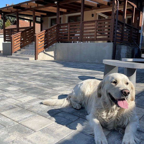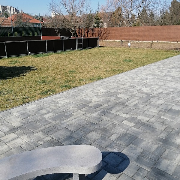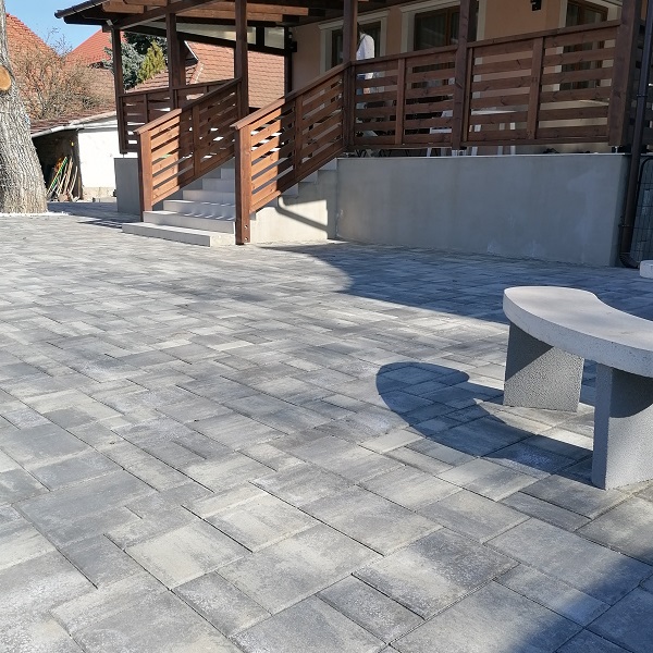 A modern, borovi fenyő teraszhoz keresett a vevő egy prémium minőségű, letisztult térkövet. Választása a Maroskő 6 Grafit termékünkre esett, amely tökéletes kontrasztot alkot a füvesített területtel.
