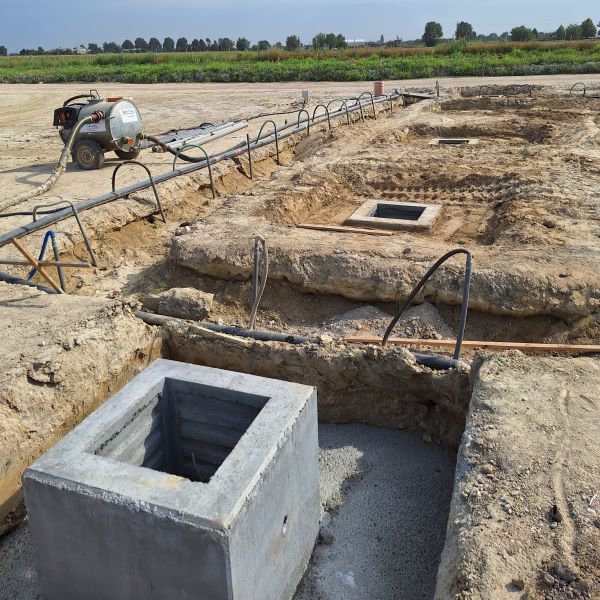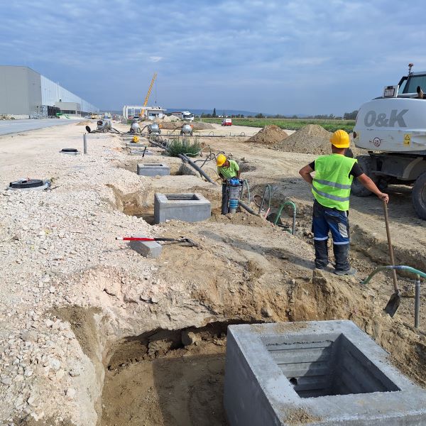 A járműmosó és karbantartó épületek esetében az alapozást is cégünk végezte, melynek része volt a munkaterületek víztelenítése. Vákuumkutas technológiával süllyesztettük az alapozási sík alá a magasan álló talajvizet.