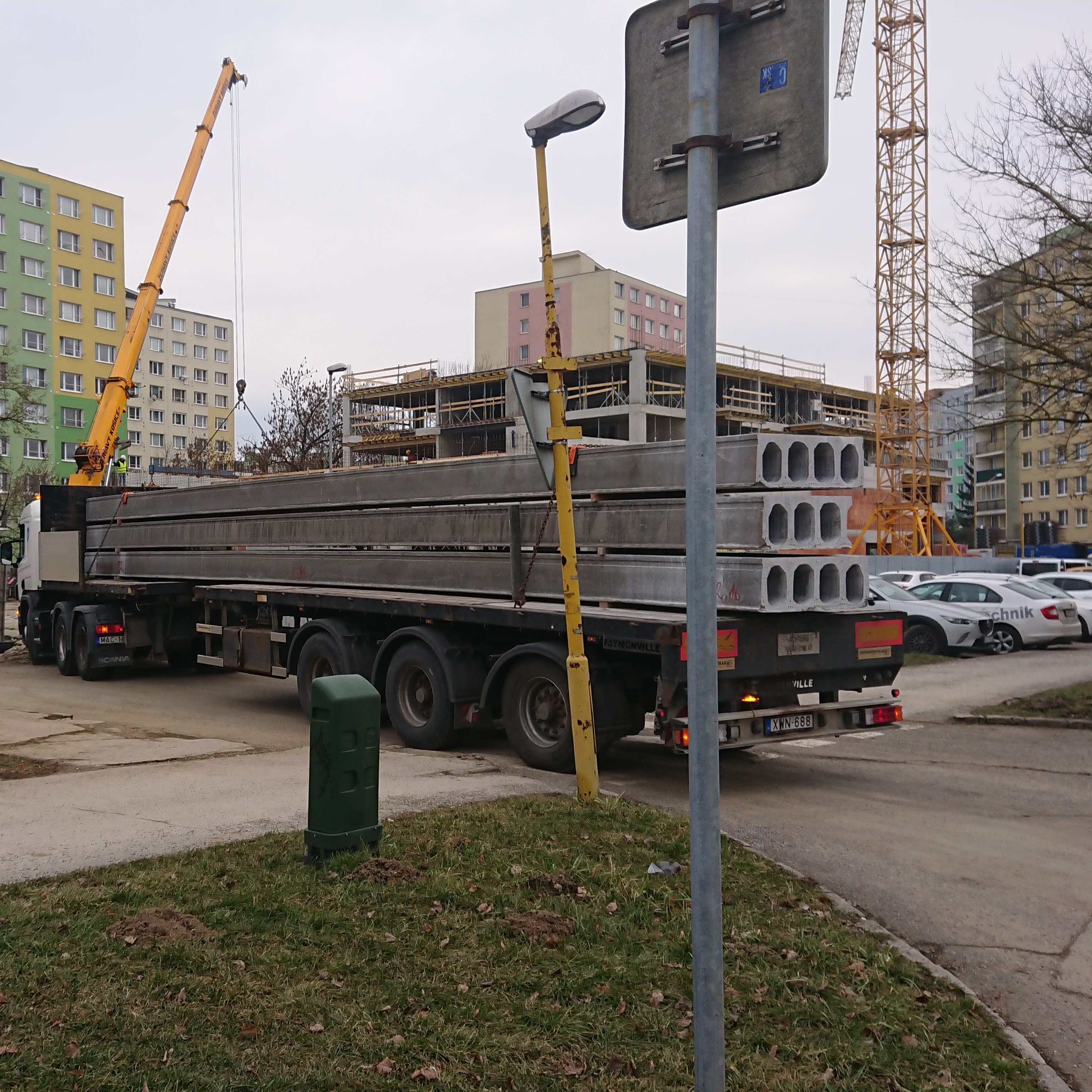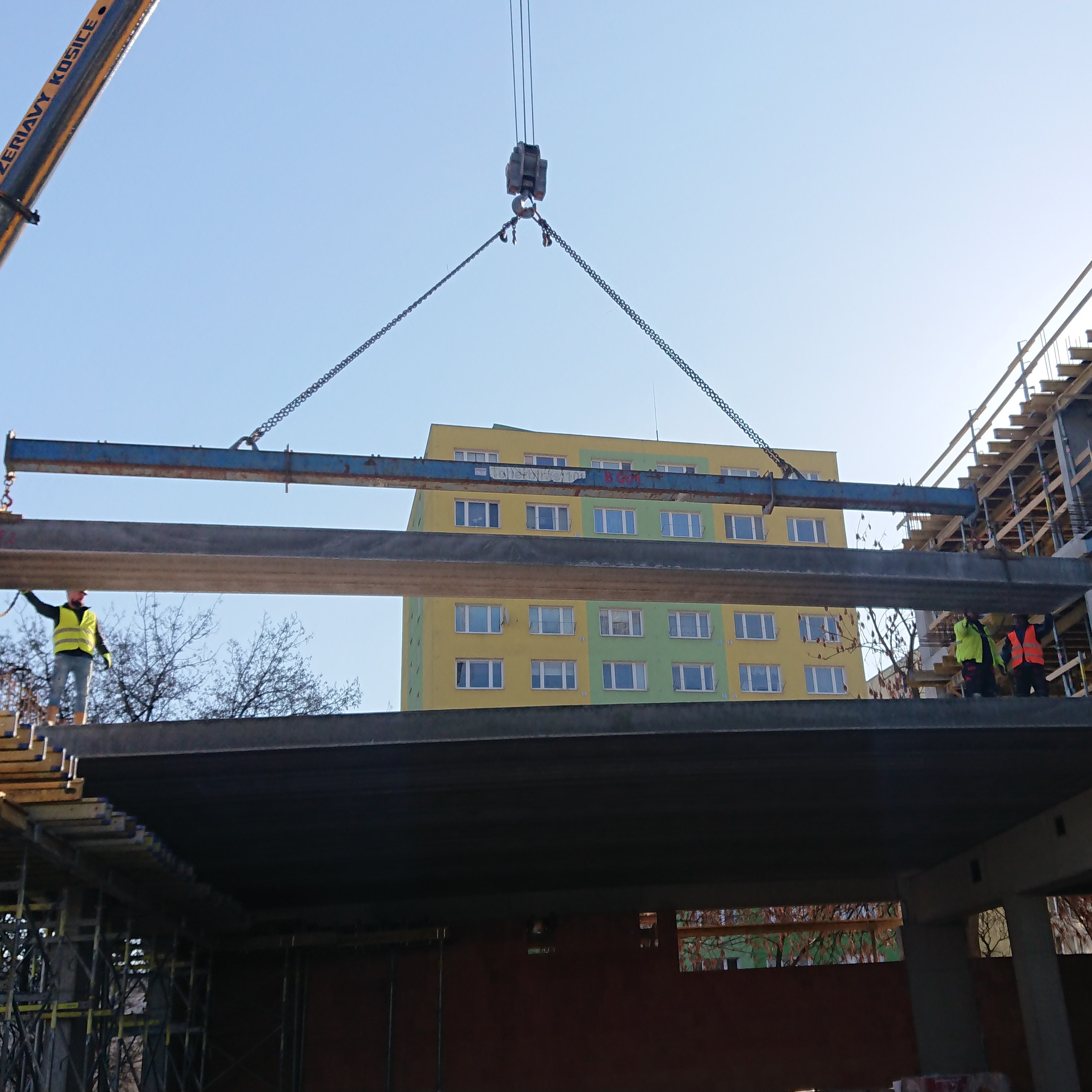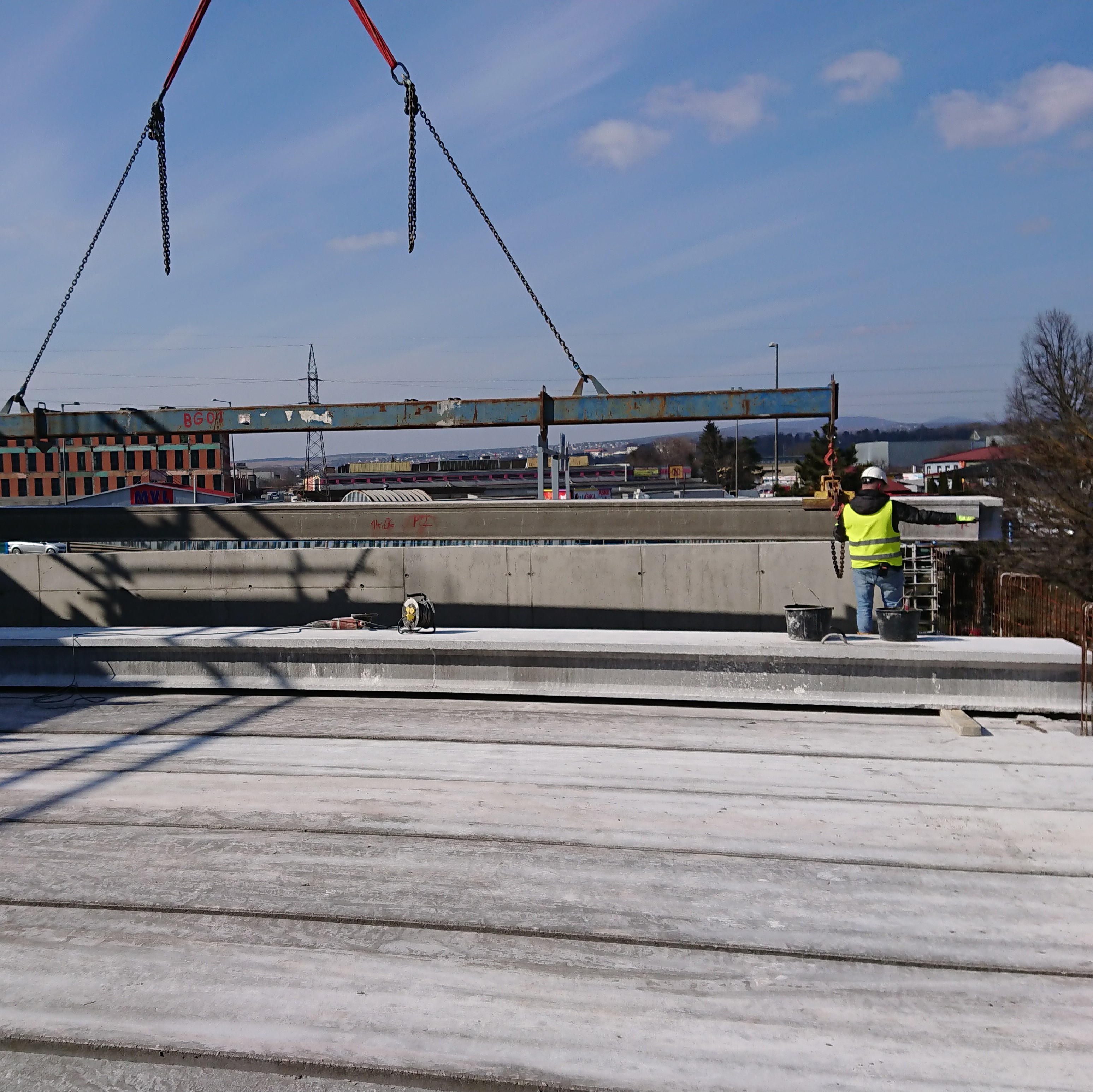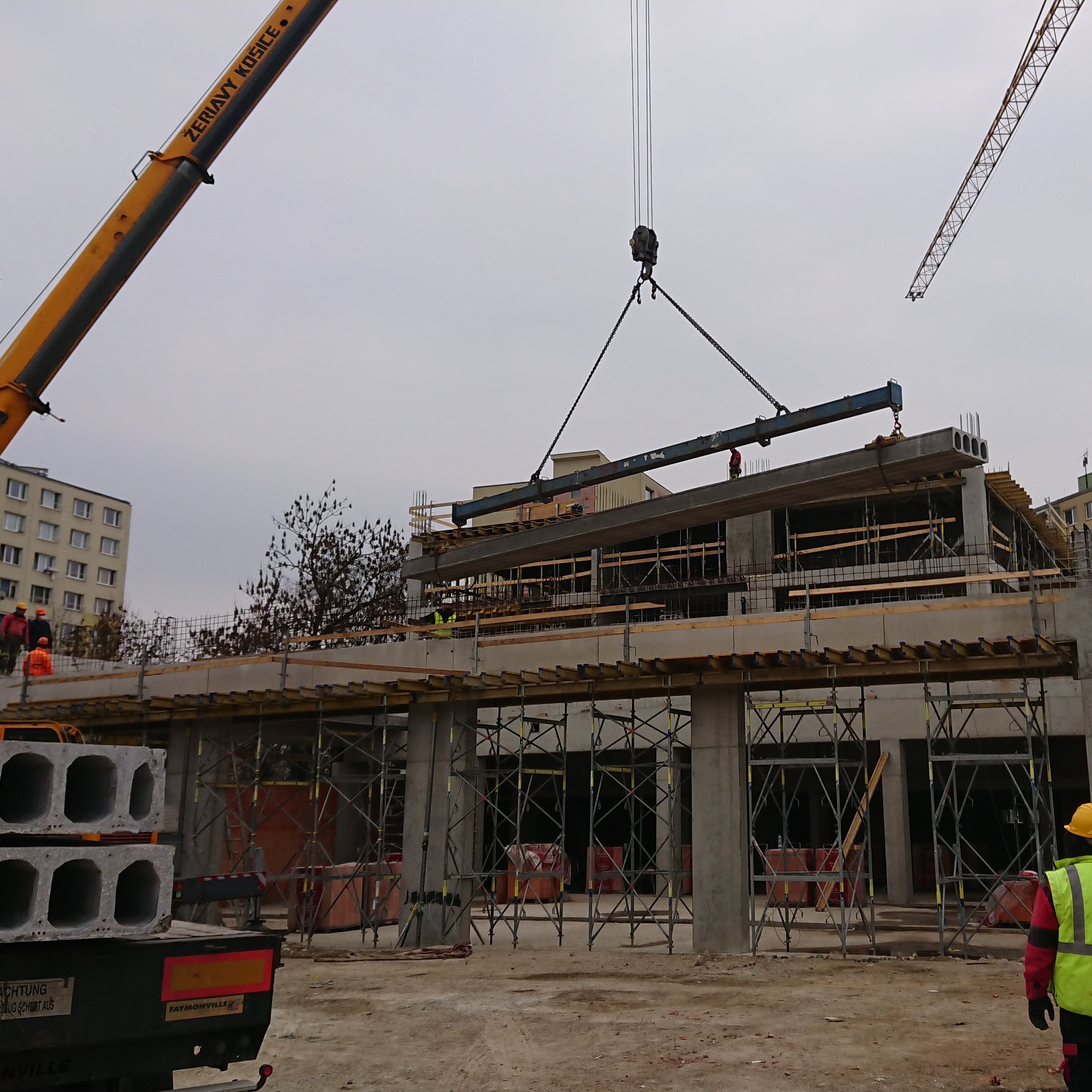 Kassa egyik bővülő lakótelepén építettek egy új polifunkcionális épületet. Az itt elhelyezkedő KLAS üzletlánc zárófödéméhez cégünk gyártott 387 m² 15 m hosszú MF400 feszített födémpaneleket.