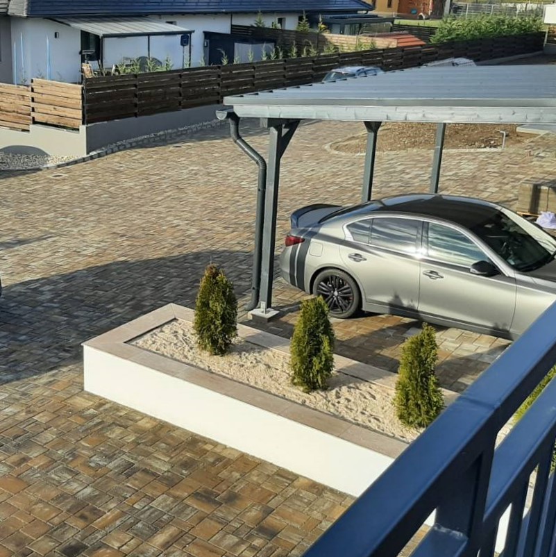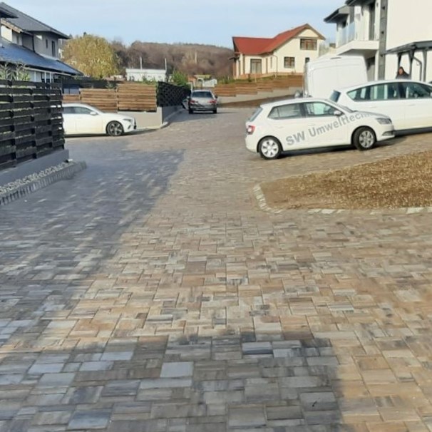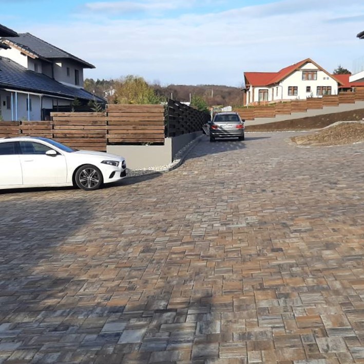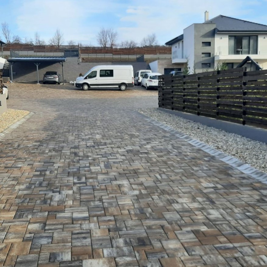 Egy exkluzív, domboldali felsőkategóriás lakópark ékének választották a Maroskő Dióhéj térkövünket. A barnás színek tökéletesen illenek a természet közeli környezethez, az antracit vonalának köszönhetően pedig alkalmazkodik a modern fekete-fehér színekben domináló épületekhez is.