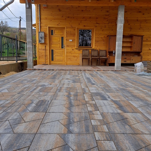 A Hernád partján fekvő új építésű nyaraló kertje 8 cm vastag dióhéj színű Mozaikkővel lett burkolva, melynek különleges geometriai formái egyedivé teszik a barátságos hangulatú faház udvarát.