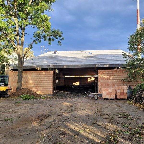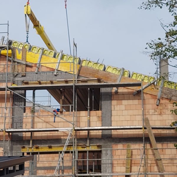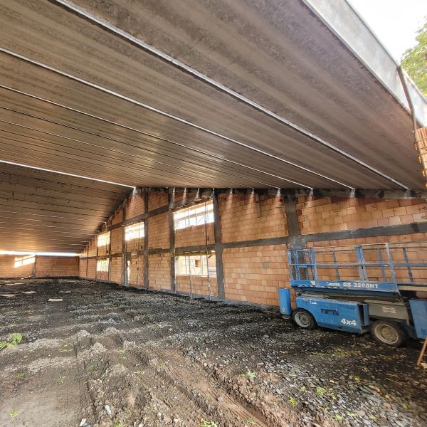 A teniszcsarnok építtetője már több pécsi projekthez is rendelt tőlünk födémpanelt, így már a tervezés fázisában bevont minket. A teniszcsarnok játék által megkívánt formája 17◦ hajlásszögű tetőt igényelt, amely a különösen nagy fesztáv miatt egyedi megoldást igényelt. A nyeregtetőt alkotó panelek a pálya hossztengelyére merőlegesen ülnek fel a két hosszanti, falmerevítő pillér-gerenda szerkezettel megerősített téglafalra. Az egyes panelek pozícióját és megcsúszás elleni védelmét egyedi acélszerelvények biztosítják.