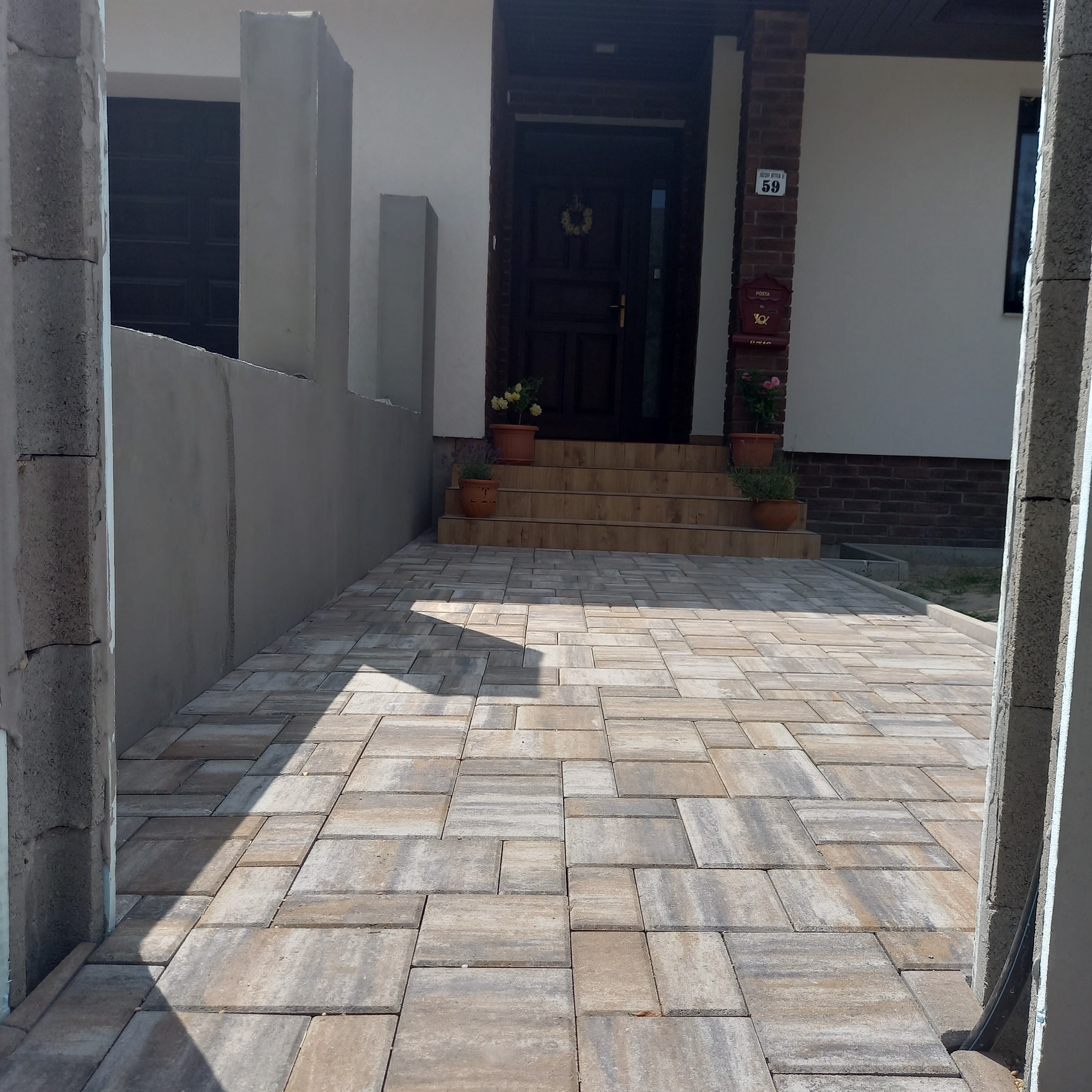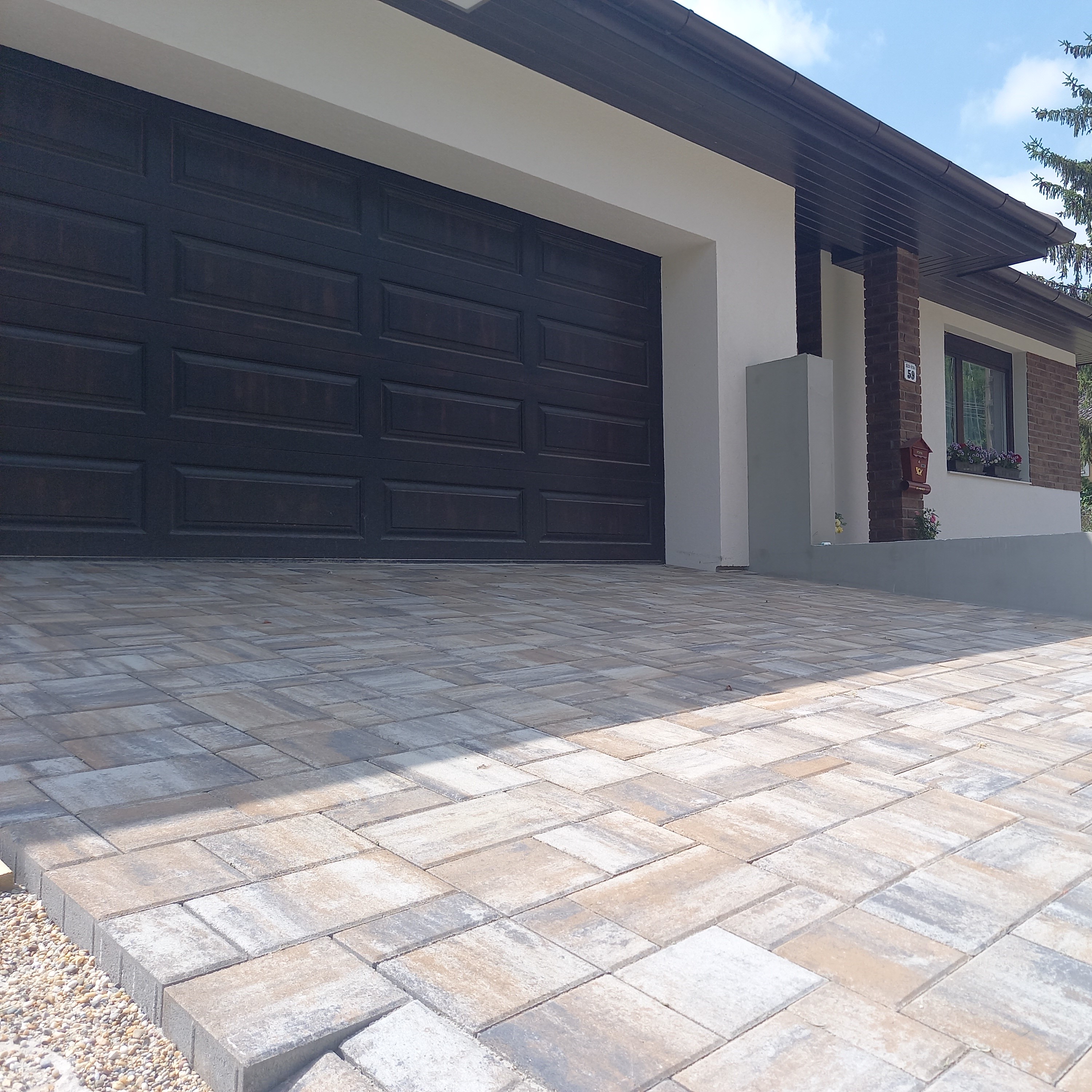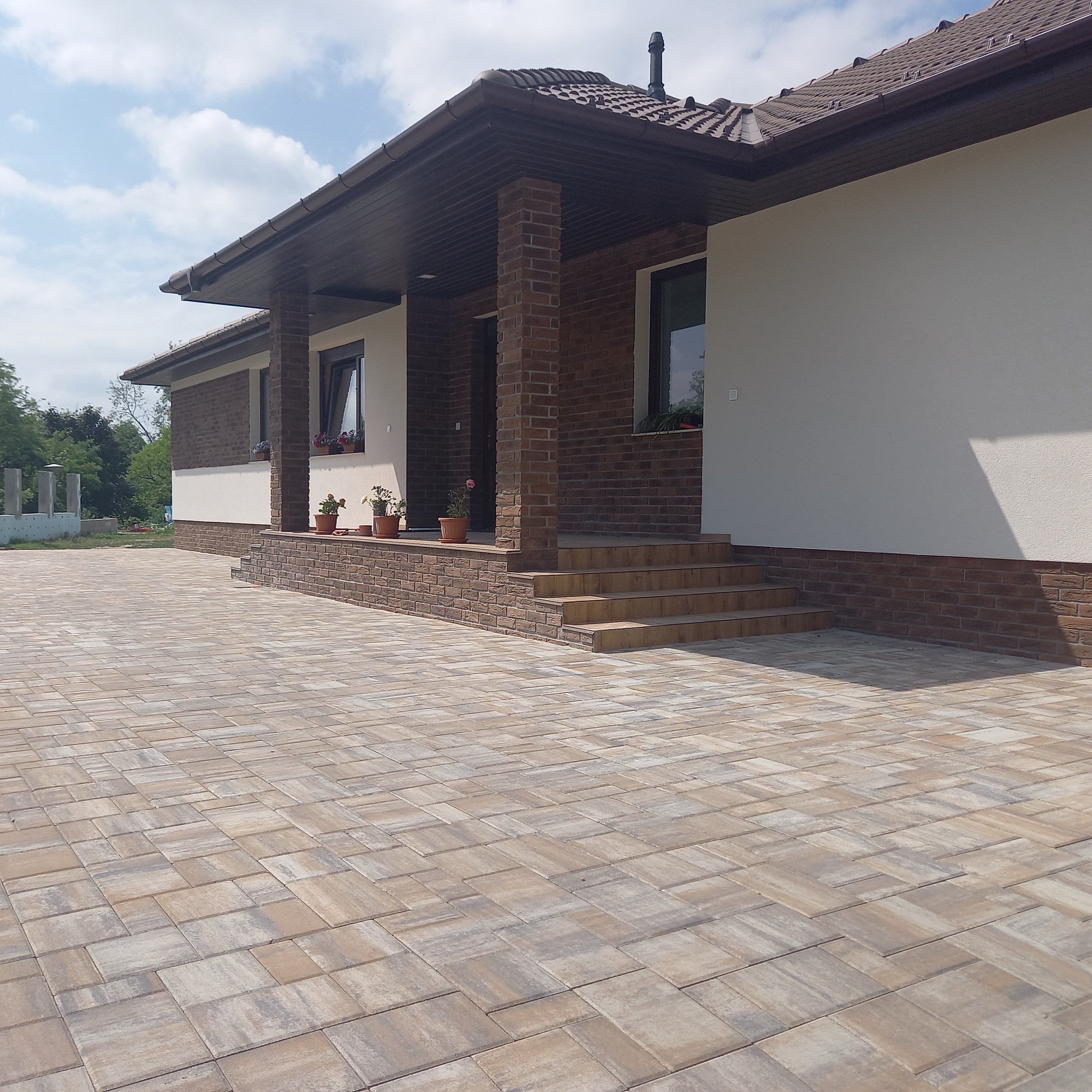 A Monath Co Kft. komáromi telephelyén keresztül értékesítettünk 240 m² Maroskő 6 cm dióhéj színű térkövet Nagyigmánd egyik családi házának udvarára. A térburkoló harmóniában van a ház színeivel és stílusával.